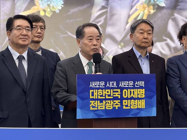 | ▲ 최형식 전 담양군수 등이 10일 오전 광주광역시 민형배 후보 측 경선사무소에서 기자회견을 열고 김영록 경선 후보를 비판하고, 민 후보를 지지하는 입장을 발표하고 있다. |