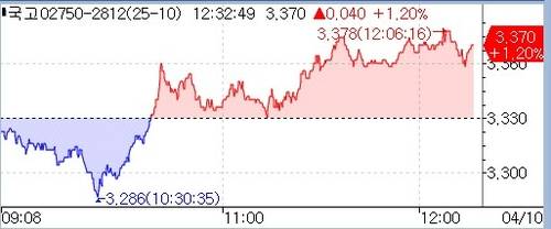 국고채 3년 금리는 전일 민평금리 대비 4.0bp 오른 3.370%를 나타냈다.