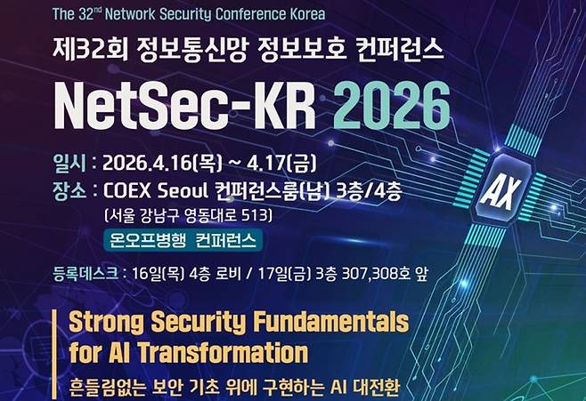 [보안뉴스 원병철 기자] 한국인터넷진흥원(원장 이상중, KISA)이 주최하고 한국정보보호학회(회장 김호원, KIISC)가 주관하는 제32회 정보통신망 정보보호 컨퍼런스(NetSec-KR 2026)가 오는 4월 16일(목)부터 17일(금)까지 이틀간 서울 삼성동 코엑스에서 개최될 예정이다.