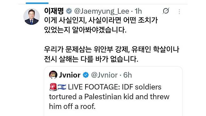 이 대통령이 공유한 글에는 이스라엘 방위군(IDF)이 팔레스타인 어린이를 고문한 뒤 옥상에서 밀어서 떨어뜨리는 장면이라는 주장의 설명이 달려있습니다.