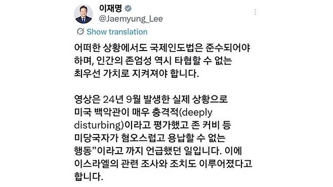 이후 이 대통령은 엑스에 추가로 글을 올려 "해당 영상은 2024년 9월 발생한 실제 상황으로, 미국 백악관이 '매우 충격적'이라고 평가했던 일"이라며 "이스라엘의 관련 조사도 이뤄졌다고 한다"고 설명했습니다.