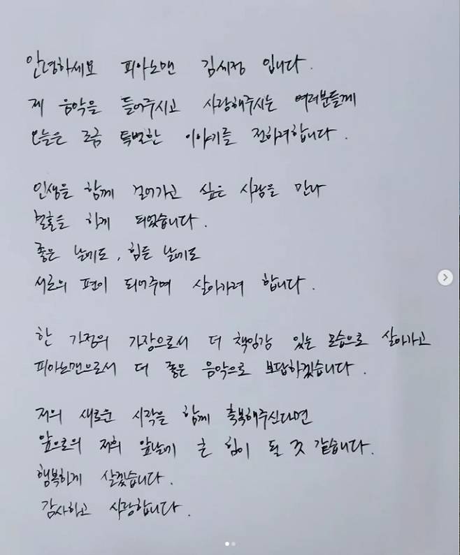 가수 피아노맨(본명 김세정)이 자필 편지로 결혼 소감을 밝혔다.
