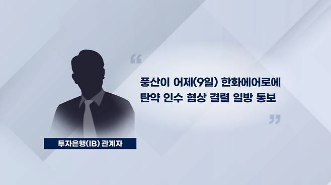 투자은행(IB) 관계자에 따르면 풍산은 어제(9일) 한화에어로스페이스에게 탄약 부문 인수 협상 결렬을 통보했습니다.