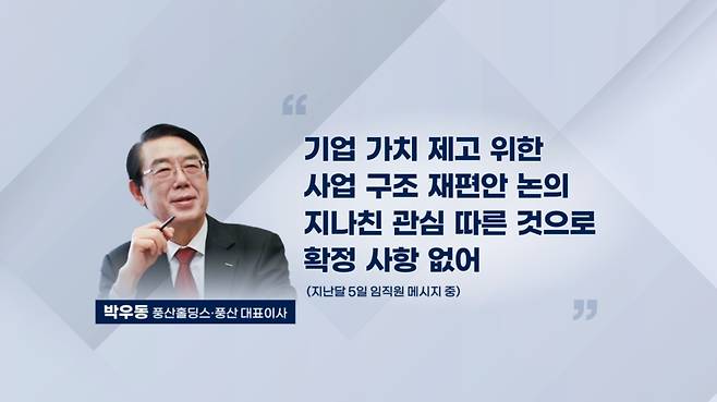 노조의 항의가 빗발치자 풍산홀딩스와 풍산 대표이사를 겸직 중인 박우동 부회장은 확정된 사안이 아니라며 진화에 나섰습니다.