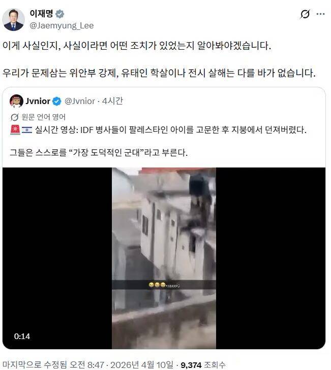 이 대통령은 이날 오전 엑스(X)에 ‘Jvnior’ 계정에 올라온 영상을 공유하며 “이게 사실인지, 사실이라면 어떤 조치가 있었는지 알아봐야겠다”며 “우리가 문제 삼는 위안부 강제, 유태인 학살이나 전시 살해와 다를 바가 없다”고 했다.