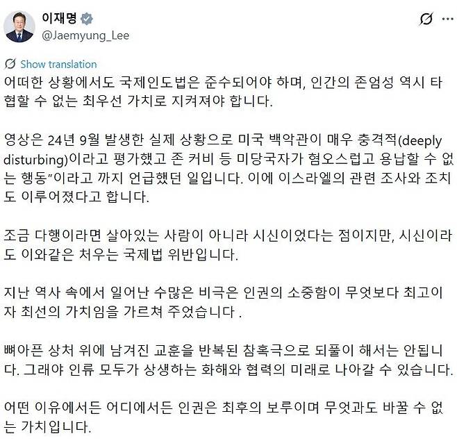 이 대통령은 오후에 엑스(X)에 올린 글에서 “조금 다행이라면 살아있는 사람이 아니라 시신이었다는 점이지만, 시신이라도 이와같은 처우는 국제법 위반”이라고 했다. 이어 “지난 역사 속에서 일어난 수많은 비극은 인권의 소중함이 무엇보다 최고이자 최선의 가치임을 가르쳐 주었다”면서 “뼈아픈 상처 위에 남겨진 교훈을 반복된 참혹극으로 되풀이 해서는 안 된다”고 했다.