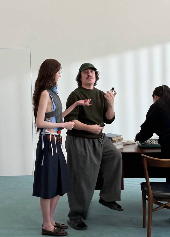 또 다른 사진에서는 타자기 앞에 앉아 작업하는 듯한 콘셉트부터 바닥에 기대 앉은 포즈까지 다양한 연출을 선보이며 몽환적인 분위기를 자아냈다. 길게 늘어진 웨이브 헤어와 또렷한 이목구비는 성숙하면서도 세련된 매력을 더했다. 영화 감독 파비앙 콩스탕트와 열정적으로 이야기를 나누는 등 프로페셔널한 모습도 포착됐다.