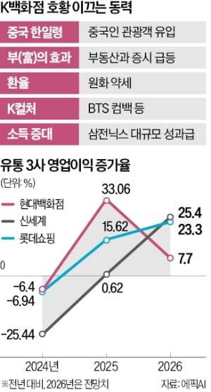 10일 리서치 및 투자정보 플랫폼 에픽AI에 따르면 백화점 중심 유통 3사(롯데쇼핑·신세계·현대백화점)의 올해 영업이익은 전년 대비 19.79% 증가할 것으로 전망된다. 작년(13.83%)에 이어 2년 연속으로 두 자릿수대 성장이 예상된다. 이런 호황은 기저효과가 반영된 코로나19 시기를 제외하면 15년여 만에 처음이다. 미국 월마트(8.9%) TJX(8%) 메이시스(-11.7%), 일본 이세탄미쓰코시(2%) 다카시마야(-7.5%), 등 글로벌 유통업체의 영업이익 증가율 전망치가 마이너스로 돌아서거나 한 자릿수대에 그치는 것과 대비된다.