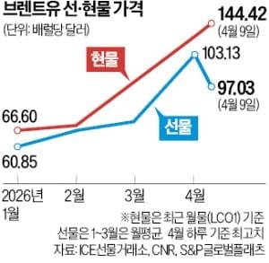 10일 글로벌 유가 기준 가격 제공업체 S&P글로벌플래츠에 따르면 지난 7일 기준 현물 브렌트유 기준 가격은 배럴당 144.42달러로 평가됐다. 이전 최고 기록인 2008년 7월 144.22달러를 넘어선 사상 최고치다. 반면 브렌트 선물 가격(최근 월물기준)은 최근 미국과 이란 합의 발표 이후 고점 대비 18% 이상 떨어졌다. 현물과 선물 가격 차이는 2022년 이후 최대다.