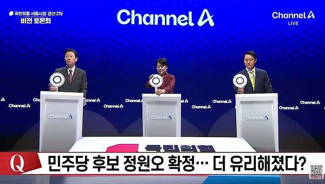 오세훈·윤희숙·박수민 후보는 10일 국민의힘 서울시장 2차 비전 토론회에서 '민주당 후보 정원오 확정더 유리해졌다?'라는 질문에 모두 'O' 팻말을 들었다.
