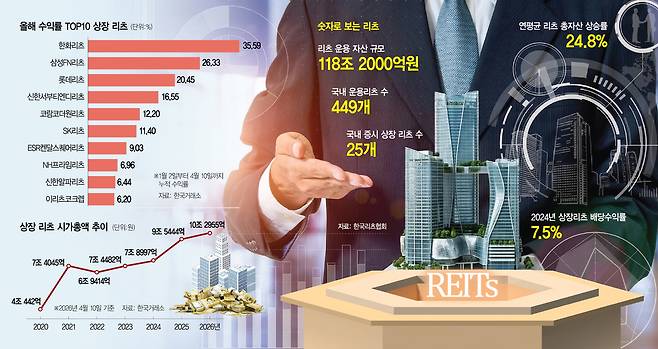 ◇도입 25년 만에 상장 리츠 시가총액 10조 원 돌파=한국리츠협회와 한국거래소에 따르면 올 2월 27일 종가 기준으로 국내 증시에 상장한 25개 리츠의 합산 시가총액이 10조 381억 원을 기록하며 10조 원을 처음으로 넘겼다. 2001년 리츠 제도가 국내에 첫선을 보인 뒤 25년 만의 성과다. 2024년 12월 말 7조 8997억 원으로 8조 원을 밑돌던 시총은 이듬해 9월 9조 2048억 원으로 9조 원을 돌파했고 속도가 붙어 5개월 만에 10조 원을 넘어섰다.