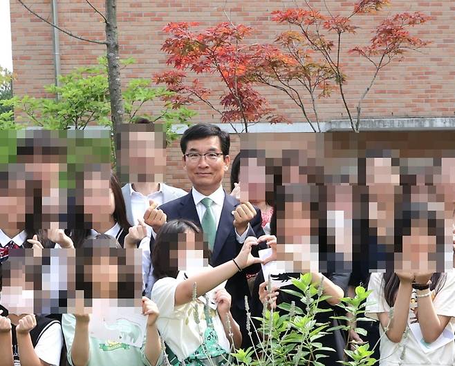 | ▲ 윤건영 충북교육감(가운데)이 지난해 6월 19일, A기업 B씨(윤 교육감 바로 왼쪽)와 함께 이 지역 한 초등학교를 방문해 탄탄숲 관련 행사를 벌인 뒤 기념촬영을 하고 있다. |