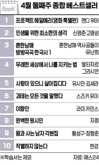 인문 도서의 강세가 두드려졌다. 신영준·고영성의 <인생을 위한 최소한의 생각>(2위)을 비롯해 라미 카민스의 <이향인>(7위), 자청의 <완벽한 원시인>(8위) 등 총 3권이 10위권에 이름을 올렸다. 영화와 연계된 도서의 인기도 꾸준히 이어졌다. 앤디 위어의 원작소설 <프로젝트 헤일메리(영화 특별판)>이 2주 연속 종합 1위를 차지했다. <왕과 사는 남자 각본집>도 9위에 자리했다. 발타자르 그라시안의 <무례한 세상에서 나를 지키는 법>이 4위를 기록하며 상위권을 형성했다.