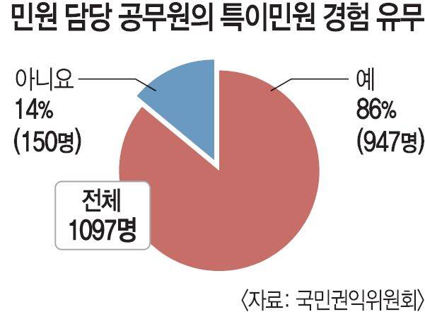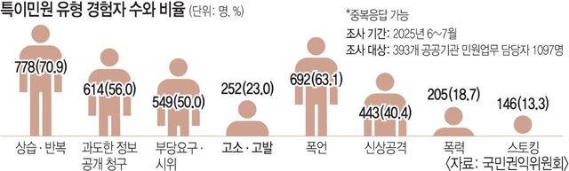 특이민원으로 인한 공무원의 고통은 수치로 드러난다. 권익위가 지난해 6~7월 393개 공공기관 민원 업무 담당 공직자 1097명을 대상으로 실시한 ‘2025 특이민원 실태조사 결과’에 따르면 응답자의 86%인 947명이 최근 3년간 특이민원을 경험했다. 문제는 특이민원 중 상당수가 공무원 개인을 상대로 한 형사 고소로 이어진다는 점이다. 권익위 조사 응답자 중 23%는 특이민원 유형 중 고소·고발을 겪은 적이 있다고 답했다.