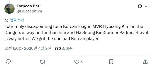 여기에 다른 한국 선수들과의 비교까지 더해지며 분위기는 더욱 험악해졌다. 댓글창의 한 팬은 "한국 KBO리그 MVP 출신이라기엔 너무 실망스럽다. 김혜성(LA 다저스)이 훨씬 낫고, 김하성(애틀랜타 브레이브스)도 훨씬 낫다. 우리는 유일하게 못하는 한국 선수를 데려왔다"는 강도 높은 비판을 쏟아냈다.