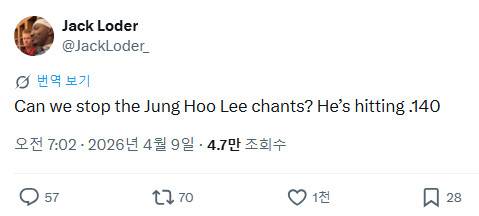 한 샌프란시스코 팬은 X(구 트위터)에 "이정후 응원 챈트도 이제 그만할 수 없나. 지금 타율이 1할4푼이다"라는 글을 올리며 직격탄을 날렸다. 문제는 이 발언이 '소수 의견'에 그치지 않았다는 점이다.