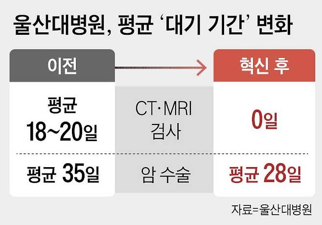 울산대병원도 원래는 이랬다. 불과 1~2년 전만 해도 이 병원에서 CT 검사를 받으려면 평균 20일, MRI(자기공명영상) 검사는 평균 18일을 기다려야 했다. 하지만 지금은 두 검사 모두 환자 방문 당일 진행이 가능하다. 사실상 대기가 없는 ‘제로 웨이팅’을 이뤄낸 것이다.