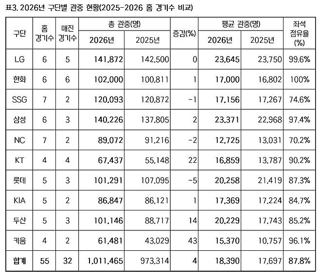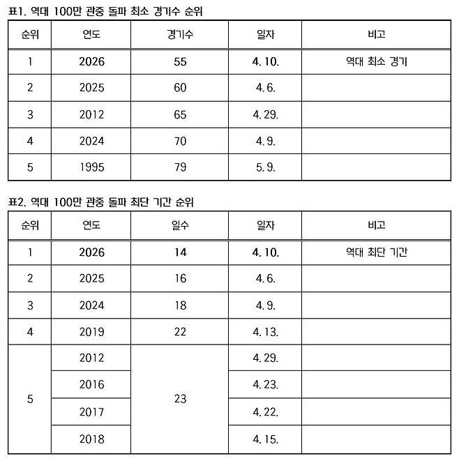 이로써 10일 경기까지 누적 관중 101만1465명을 기록하며 역대 최소 경기인 55경기만에 100만 관중을 달성했다. 종전 기록은 2025시즌에 기록한 60경기다. 10일 55경기만에 달성함에 따라 종전 기록을 5경기 앞당겼다.