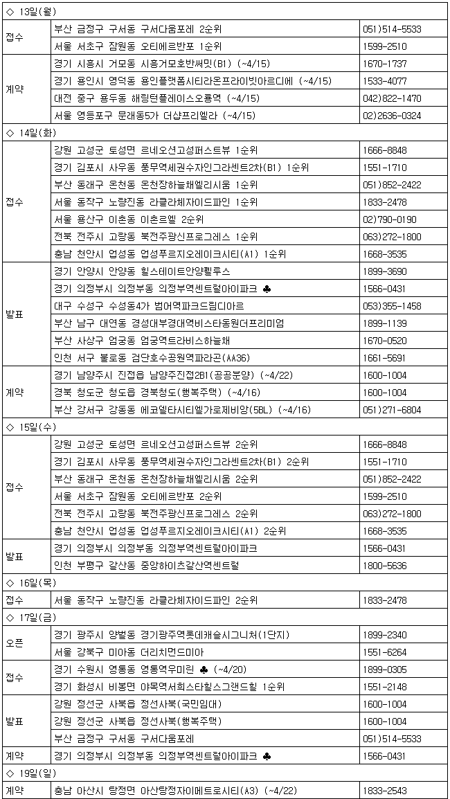 11일 부동산R114에 따르면 4월 셋째 주에는 전국 9개 단지에서 총 6천151가구(일반분양 3천844가구)가 분양을 시작한다.