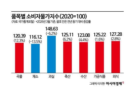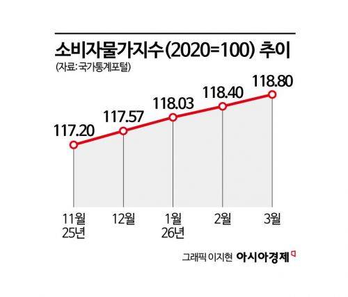 국가데이터처 국가통계포털에 따르면 지난달 소비자물가지수(2020=100)는 118.80으로 전년 동월 대비 2.2% 상승했다. 특히 곡물(12.3%)과 축산(6.2%), 수산(4.4%) 등 주요 먹거리를 중심으로 상승 폭이 컸다. 가공식품(1.6%)과 외식(2.8%)도 오름세를 이어가면서 장바구니 물가가 전반적으로 상승하는 추세다. 이에 따라 지난달 소비자심리지수(CCSI)는 107.0으로 1월(112.1)보다 5.1 포인트 하락하며 소비 심리가 얼어붙었다.