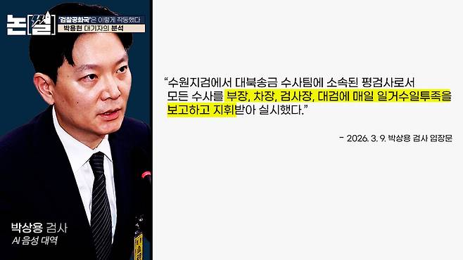 “평검사가 대북송금 사건 같은 중요한 사건을 조작하는 것은 검찰 시스템상 불가능하다. 수원지검에서 대북송금 수사팀에 소속된 평검사로서 모든 수사를 부장, 차장, 검사장, 대검에 매일 일거수일투족을 보고하고 지휘받아 실시했다.”
