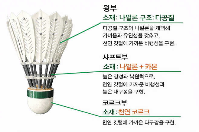천연 깃털 셔틀은 여전히 배드민턴 경기력의 기준입니다. 오리 또는 거위 깃털로 만든 전통 셔틀은 비행 궤적과 회전, 타구 직후 감속 구간까지 가장 정교한 감각을 구현해 엘리트 선수들이 표준처럼 받아들여 왔습니다. 반면 새롭게 시험대에 오른 합성 셔틀은 다공성 나일론 구조와 카본 보강 설계를 앞세워 천연 셔틀에 가까운 비행 특성을 유지하면서도 내구성과 공급 안정성을 높이려는 시도를 담고 있습니다. 다시 말해 천연 깃털 셔틀이 '현재의 기준'이라면, 합성 셔틀은 '미래의 기준'이 될 수 있을지를 시험받는 제품입니다.