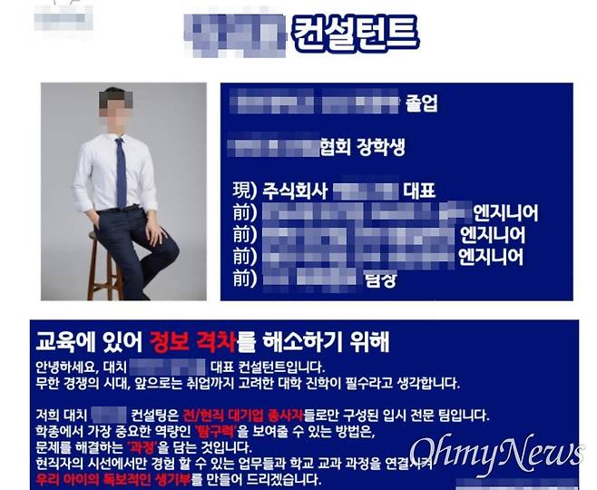 | ▲ 서울 대치동 입시컨설턴트업체 대표가 자사 블로그에 올렸다가 내린 글의 앞부분(가림 처리는 <오마이뉴스>가 한 것임). |