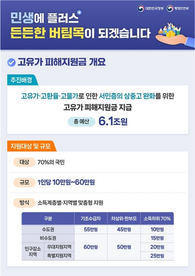 정부가 중동 전쟁으로 인한 고유가·고물가 부담을 완화하기 위해 국민 70%를 대상으로 1인당 최대 60만원의 지원금을 지급한다. 취약계층은 이달 말부터 우선 지원을 받게 된다.