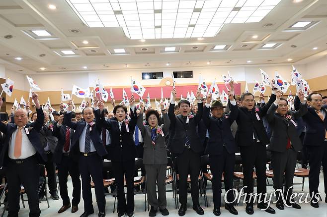 | ▲ 11일 오전 대구시청 산격청사 대회의실에서 열린 제107회 대한민국 임시정부 수립 기념식에서 참가자들이 태극기를 들고 만세를 부르고 있다. |