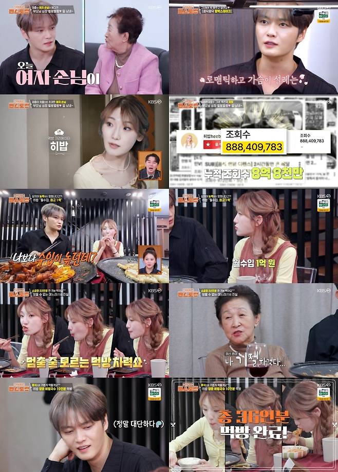 이 역사적인 순간의 주인공은 바로 평소 김재중과 절친한 사이로 알려진 먹방 크리에이터 히밥이었다. 히밥의 압도적 먹방 차력쇼를 직관한 김재중의 부모님이 “기절하는 줄 알았다”라며 혀를 내둘러 큰 웃음을 선사했다.