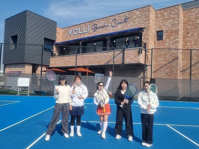 테니스 소풍을 나온 듯한 아름다운 볼리코트에서 고급 레슨을 받은 참가자 전원은 모두 만족스러운 표정으로 하나가 되었다.