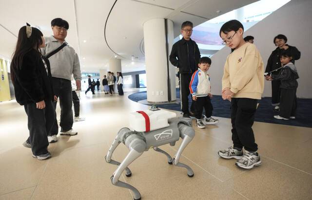 11일 수원특례시 영통구 경기도서관에서 열린 인공지능 로봇 체험전 ‘로봇을 이겨라!’에서 어린이들이 4족 보행 로봇인 댕댕로봇을 신기한 듯 바라보고 있다. 이번 행사는 경기도서관에 지하 1층부터 4층까지 각 층에 배치된 피지컬 AI 로봇을 시민이 직접 체험하는 행사로 진행됐다.