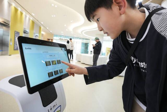 11일 수원특례시 영통구 경기도서관에서 열린 인공지능 로봇 체험전 '로봇을 이겨라!'에서 한 어린이가 안내 로봇 테미를 통해 도서 퀴즈를 진행하고 있다.