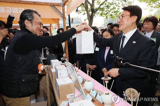 (전주=연합뉴스) 이정훈 기자 = 김민석 국무총리가 11일 전북 전주실내체육관에서 열린 동행축제 개막식에서 참가 업체 부스를 둘러보고 있다. 2026.4.11
