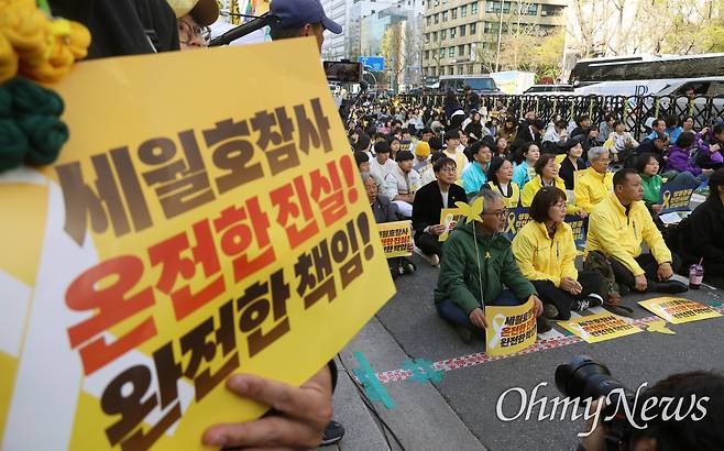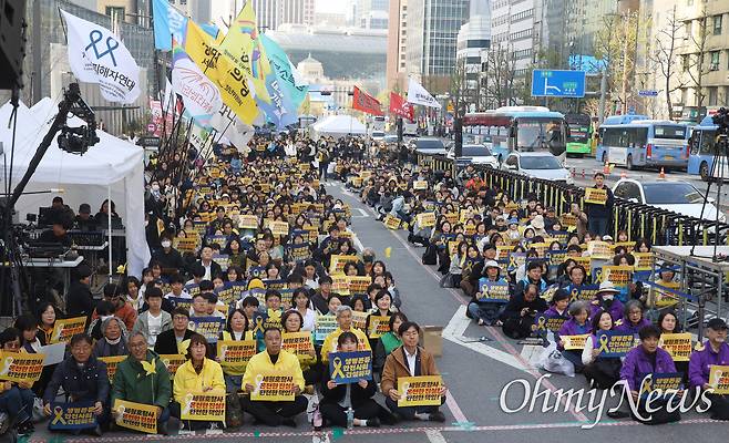 | ▲ 세월호 참사 유가족과 시민들이 11일 오후 서울 중구 시청역 앞에서 열린 4.16 세월호 참사 12주기 기억·약속 시민대회에 참석해 세월호 참사를 추모하며 진실 규명과 생명안전 사회를 촉구하고 있다. |