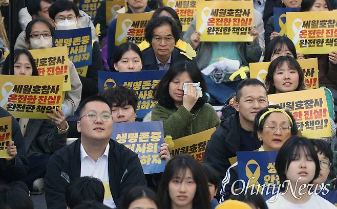 | ▲ 11일 오후 서울 중구 시청역 앞에서 열린 4.16 세월호 참사 12주기 기억·약속 시민대회에서 시민들이 지난 12년 동안 진실을 찾아온 과정과 생명안전을 위한 피해자와 시민들의 활동 영상을 보며 눈물을 훔치고 있다. |
