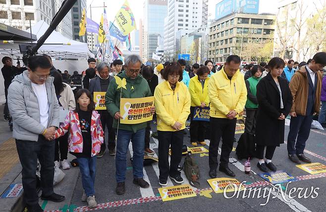 | ▲ 세월호 참사 유가족과 박주민 더불어민주당 의원, 한창민 사회민주당 공동대표, 시민들이 11일 오후 서울 중구 시청역 앞에서 열린 4.16 세월호 참사 12주기 기억·약속 시민대회에 참석해 세월호 참사 희생자를 추모하며 묵념하고 있다. |