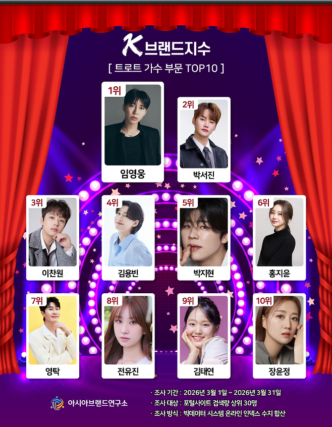 이번 K-브랜드지수 트로트 가수 부문은 포털사이트 검색량 상위 30명을 대상으로, 2026년 3월 1일부터 3월 31일까지의 온라인 빅데이터 6억 4673만 3121건을 분석했다. 특히 이번 순위는 팬덤 투표 기반 '스타덤(Stardom) 인덱스'가 공식 반영된 K-브랜드지수 결과로, 팬덤 참여 데이터를 대중문화 산업의 브랜드 영향력 평가에 본격적으로 적용해 신뢰도를 높였다.