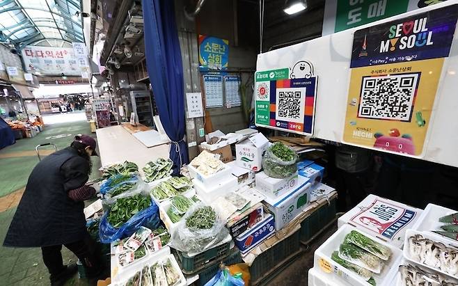 [서울 마포구 망원시장의 한 상점에 서울페이와 온누리상품권 등 QR코드 안내문이 붙어있다. (사진=연합뉴스)]