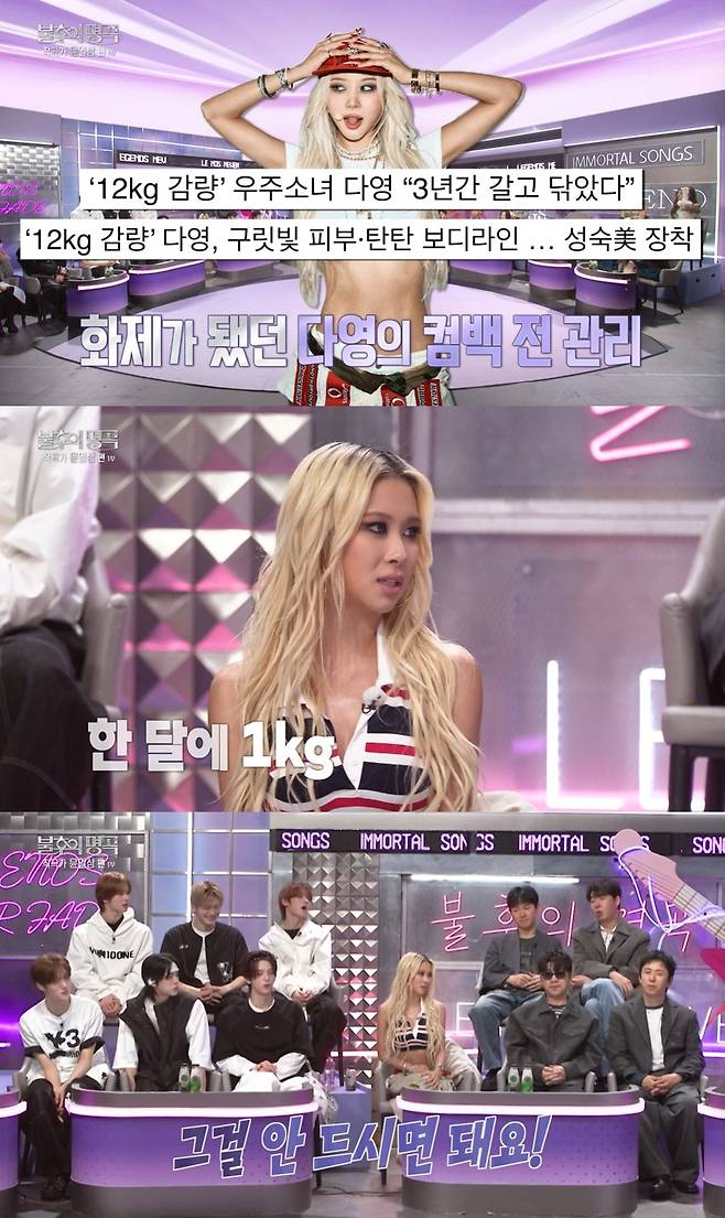 꿀팁을 묻자 다영은 "정말 많은 질문을 받았다. 방법은 모두 알고 계신다"며 "'이거 먹으면 살 찌겠는데? 건강에 안 좋겠는데?' 싶은 것을 안 드시면 된다"고 명쾌한 답을 말해 웃음을 자아냈다.
