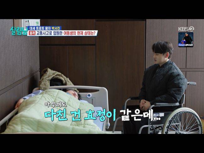 11일 방영된 KBS2TV 예능 '살림남2'에서는 트롯 황태자 박서진이 등장했다. 박서진은 동생 박효정과의 케미로 유명한데, 이날 박서진이 처음 모습을 드러낸 건 병원이었다. 입원해 있는 건 박효정이었다. 박서진은 박효정의 몸을 일으켜 세우려는 등 나름 간호를 했으나 박효정은 괴로워할 뿐이었다.