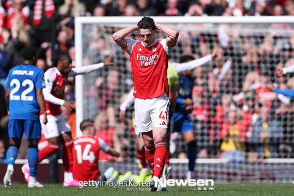 아스널이 본머스에 발목을 잡히면서 우승 경쟁이 또 미궁 속으로 빠져들었다. 리그 32경기 21승 7무 4패 승점 70점을 기록한 아스널은 2경기를 적게 치른 맨시티에 승점 9점 차 앞서고 있다. 맨시티가 잔여 경기에서 모두 승리한다면 승점 차는 3점까지 줄어든다.(사진=데클란 라이스)