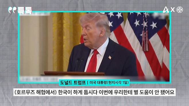 "(호르무즈 해협에서) 한국이 하게 둡시다. 이번에 우리한테 별 도움이 안 됐어요. 우리만 핵무장 세력(북한) 바로 옆, 위험 속에 4만 5천 병사들을 두고 있잖아요. 한국이 하게 두자고요.“