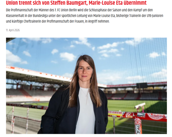 에타 감독은 공식적인 선임 절차를 밟은 '분데스리가 최초의 여성 감독'이 됐다. 유렵 5대 리그 기준으로도 1군 팀 최초의 여성 감독이다. 에타 감독은 올 시즌 리그 잔여 5경기 동안 우니온 지휘봉을 잡고 시즌 종료 후에는 1군 여성팀 사령탑으로 직무를 옮긴다.