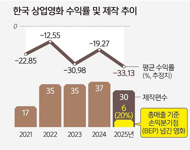 지난해 개봉한 상업영화 30편 중 손익분기점(BEP)을 넘는 작품은 6편, 2024년에는 전체 37편 중 8편에 그쳤다. 이로 인해 대다수 제작사는 차기작을 기획·개발할 여력이 없는 상황이다. 수익이 악화하니 투자자는 영화 투자에 보수적으로 돌아섰고, 투자배급사는 새로운 영화 기획을 주저하게 되고, 기획·개발 투자가 축소되니 다시 경쟁력 있는 작품 부족으로 이어지는 악순환이다.