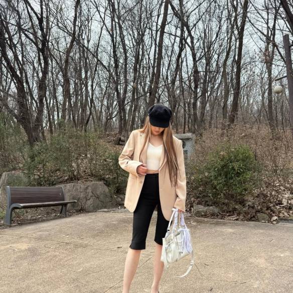 르세라핌 허윤진은 카프리 팬츠를 감각적인 스타일로 완벽하게 소화했습니다. 타이트한 핏의 블랙 팬츠에 화이트 크롭탑을 매치하고 베이지 컬러의 넉넉한 재킷을 툭 걸쳐 트렌디한 바이브를 뽐냈죠. 여기에 뉴스보이 캡과 아찔한 스틸레토 힐을 믹스매치해 관능적이면서도 세련된 아웃핏을 완성했습니다. 다리가 길어 보이고 싶다면 허윤진처럼 앞코가 뾰족한 슈즈를 선택하는 것이 좋은 팁이 될 거예요.