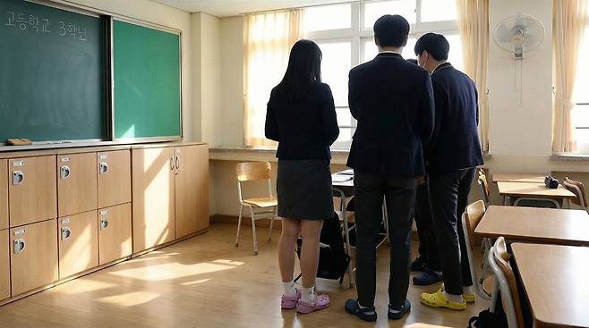 교실에서 크록스를 신고 있는 학생들. AI생성 이미지.