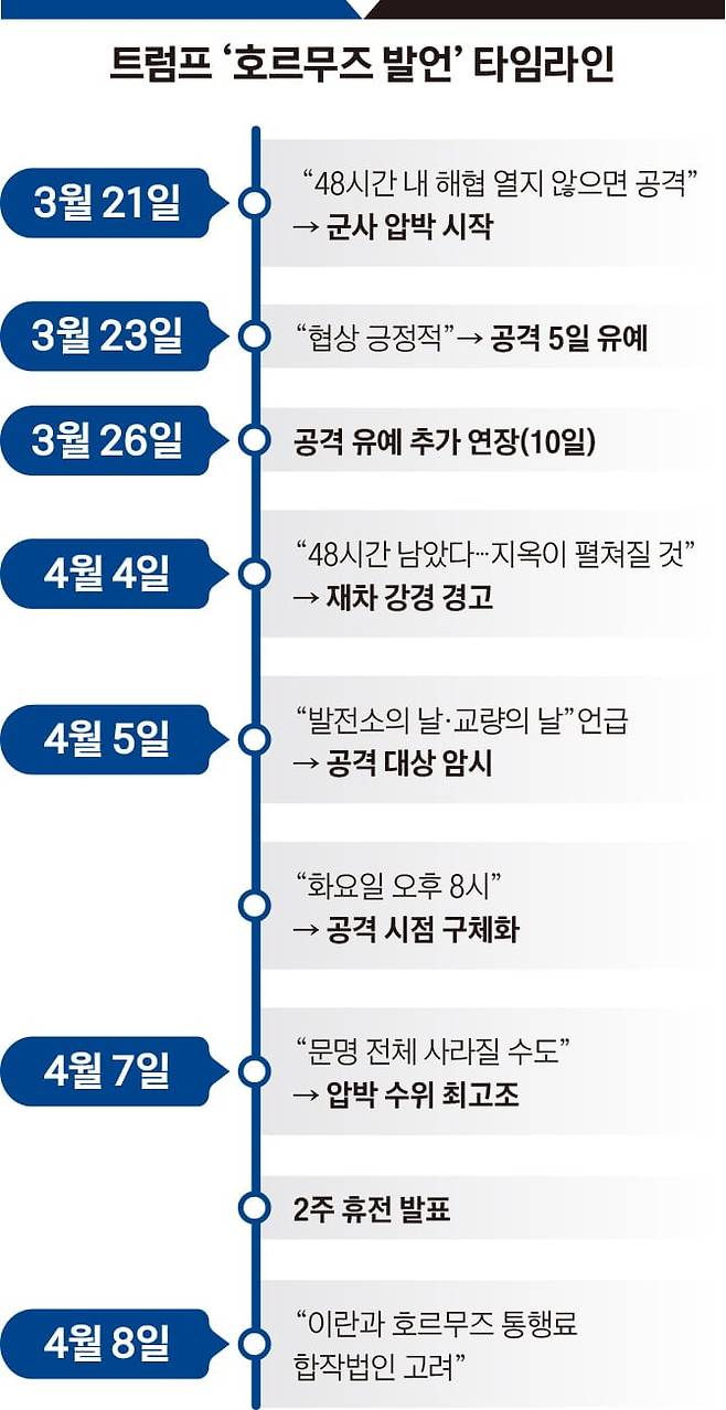 이란을 공격하며 ‘문명 파괴’까지 언급할 정도로 압박수위를 높여가더니 며칠 만에 호르무즈 통행료 사업이 ‘이란 재건’을 위한 좋은 수단이 될 것이라며 ‘아름다운 일’이라고 응원에 나섰다.