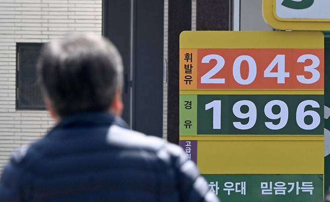3차 석유 최고가격제가 시행된 지 사흘째인 12일 서울 마포구의 한 주유소에 유가 정보가 표시돼 있다.