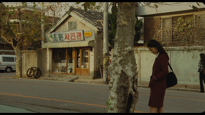 이 영화는 감정의 무게를 사건으로 밀어붙이는 대신 인물들의 일상적 리듬과 반복 속에서 서서히 감정을 쌓아간다. 그 과정에서 카메라는 인물을 클로즈업하기보다는 오히려 거리를 두며 공간과 인물과의 관계를 유지한다. 사진관, 골목길, 유리창은 단순한 배경이 아니라 정서의 매개체로 기능하며 두 인물 사이의 거리를 시각적으로 드러낸다. 특히, 유리창을 사이에 둔 시선의 교차는 말보다 많은 것을 전달한다. 실제로 이 영화에서 정원은 다림을 가까이 두되 다가가지 않으며, 창문이라는 물리적 장치를 통해 정서적 거리두기를 암시한다.